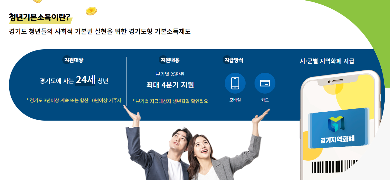 경기도 청년기본소득은 만 24세 청년들에게 분기별 25만원(연 최대 100만원)을 지역화폐로 지급하는 정책입니다. 청년의 사회적 기본권 보장과 지역경제 활성화를 목적으로 하는 혁신적인 청년 지원 정책입니다.