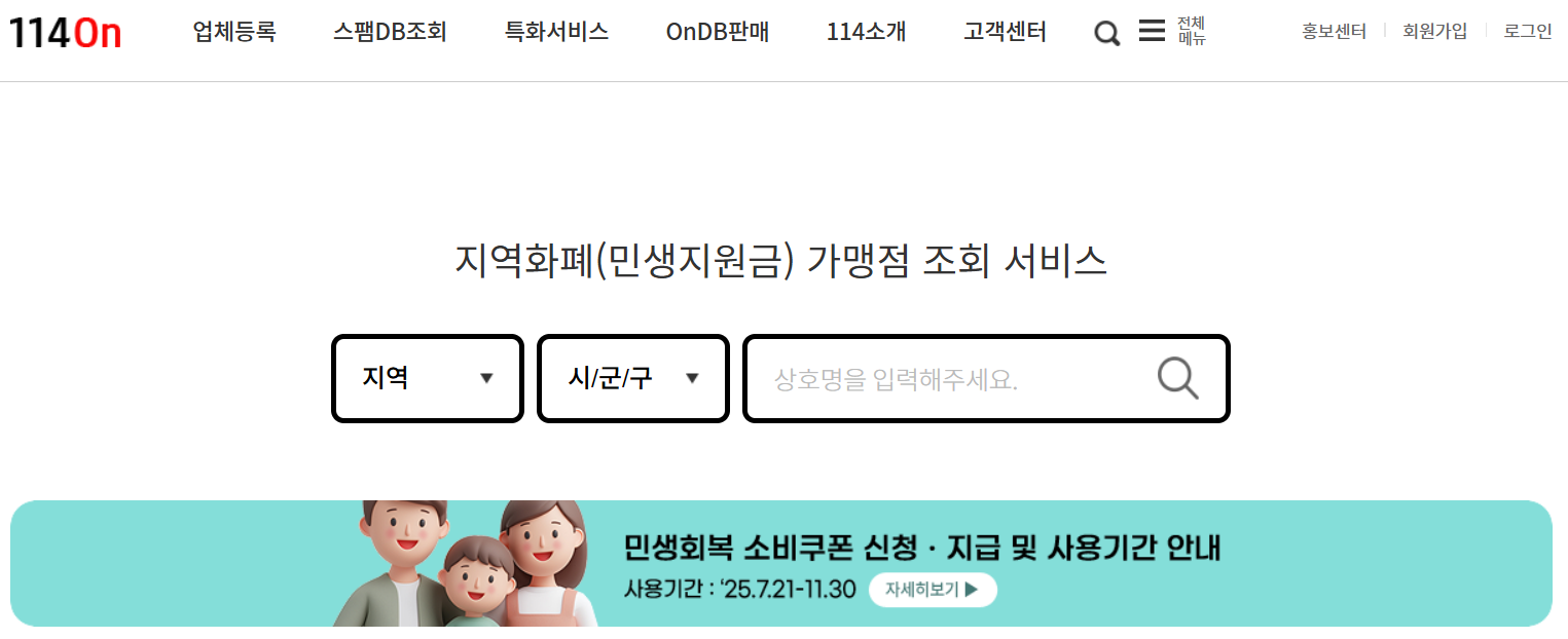 114 공식 홈페이지인 '114On' 홈페이지에서도 확인 가능합니다. 전통시장, 소상공인 매장, 지역 상권 내 가맹점 등 소비쿠폰 사용 가능 업체를 간편하게 확인할 수 있다.
