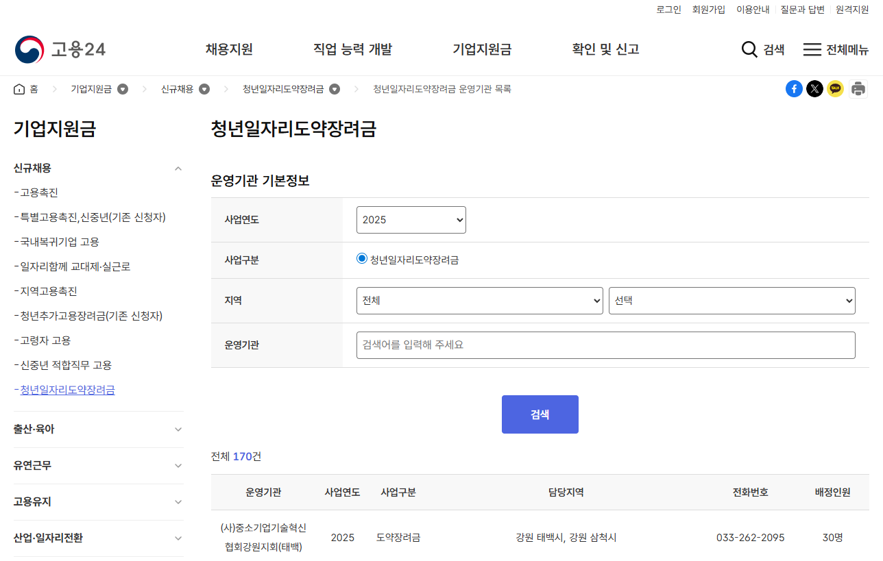 - 상단 '기업' 탭에서 "도약장려금 운영기관" 검색